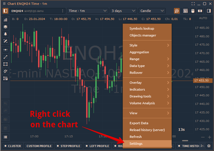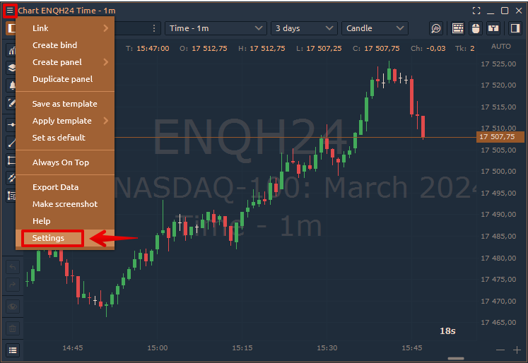 Here you will learn about the basic chart settings in Quantower. To access this menu, right-click on the chart and select 'Settings' in the menu.