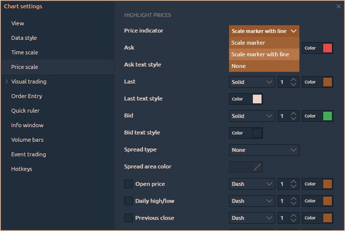 * **Highlight prices**. This feature adjusts the color and font of the current price on the chart.
