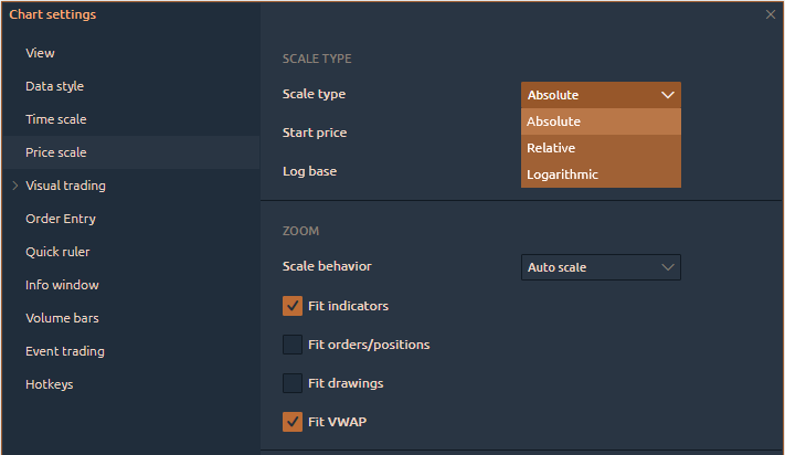 * **Scale type**. This allows you to choose which type of scale will be displayed on the chart, such as a normal display, percentage display, or logarithmic scale.
