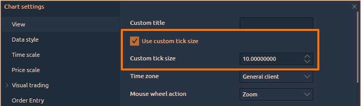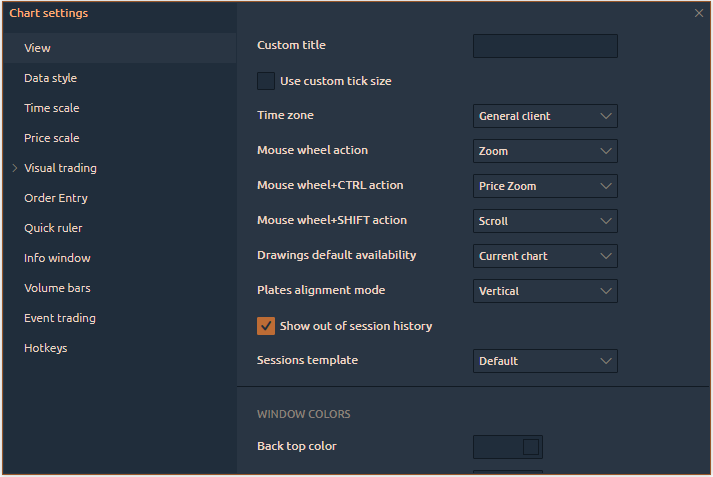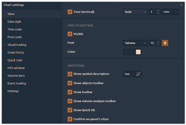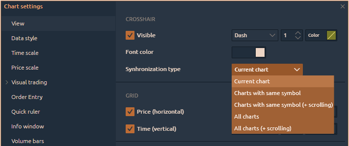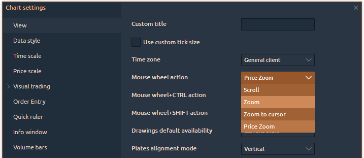 The View Chart settings allow users to customize various aspects of how charts are displayed and interact with different features in the platform.