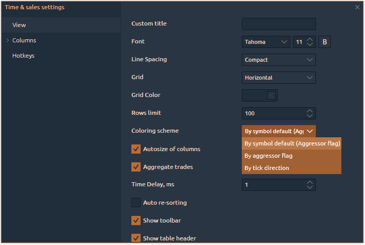 The basic settings in Time & Sales are similar to the parameters of most panels in Quantower — full flexibility in color settings, fonts, columns visibility, data position relative to the column, etc.&#x20;