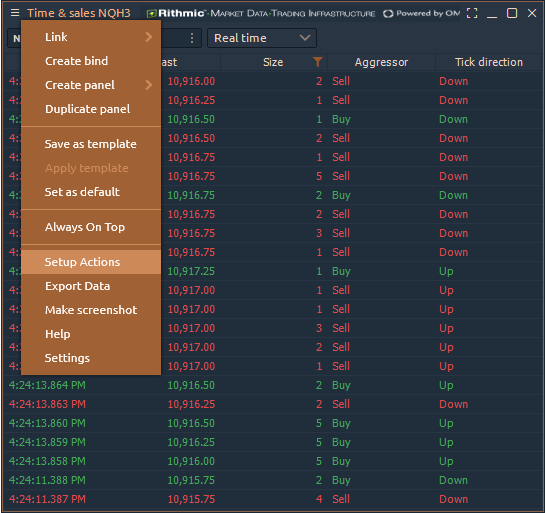 Time & Sales panel keeps a running record of trades for selected instruments displayed in chronological order. Each new entry is added to the top of the list, causing the panel screen to auto-scroll downward.