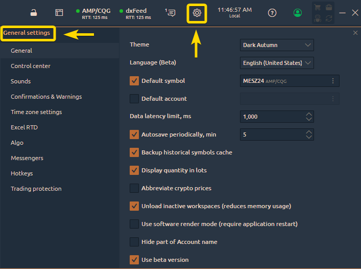 <figure><img src="https://4186075531-files.gitbook.io/~/files/v0/b/gitbook-x-prod.appspot.com/o/spaces%2F-LD6FsRvQ3jgwJIg6O7r%2Fuploads%2FzqpCsDjh6hGjVRdjUnJh%2Fimage.png?alt=media&#x26;token=507a159c-8804-47bd-947b-55a48c74252f" alt=""><figcaption><p>General settings of Quantower — Localization, Themes, Sounds, RTD, Time zones</p></figcaption></figure>