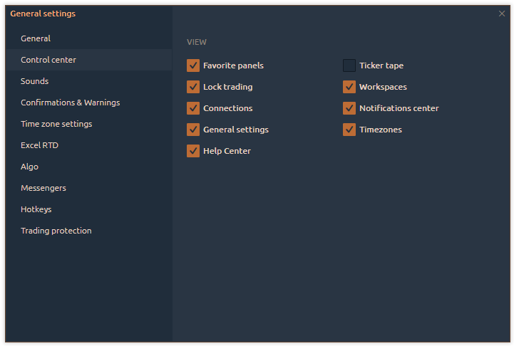 <table data-header-hidden><thead><tr><th>Confirm order placement</th><th width="95.33333333333331">true</th><th>Ask before placing an order</th></tr></thead><tbody><tr><td><strong>Confirm order placement</strong></td><td>true</td><td>Ask before placing an order</td></tr><tr><td><strong>Confirm order cancellation</strong></td><td>true</td><td>Ask before canceling an order</td></tr><tr><td><strong>Confirm order/position modification</strong></td><td>true</td><td>Ask before an order or position modifications apply</td></tr><tr><td><strong>Confirm position reversing</strong></td><td>true</td><td>Ask before reversing the position</td></tr><tr><td><strong>Confirm application close</strong></td><td>true</td><td>Ask before closing the Quantower platform</td></tr><tr><td><strong>Confirm bind close</strong></td><td>true</td><td>Ask before closing binds</td></tr><tr><td><strong>Confirm group close</strong></td><td>true</td><td>Ask before closing groups</td></tr><tr><td><strong>Show deal tickets</strong></td><td>true</td><td>Show the pop-up screens with the trading notifications</td></tr><tr><td><strong>Confirm hotkeys action</strong></td><td>true</td><td>Ask before making any action with Hotkey</td></tr></tbody></table>