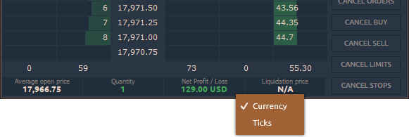 By right-clicking on the **Net PnL** field, you can change the value to **Currency** or **Ticks**.