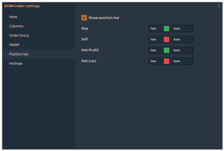 <figure><img src="https://4186075531-files.gitbook.io/~/files/v0/b/gitbook-x-prod.appspot.com/o/spaces%2F-LD6FsRvQ3jgwJIg6O7r%2Fuploads%2FmzbcPHtvHdMLm2wcmW5v%2FDom%20trader%20settings%20position%20bar.png?alt=media&#x26;token=ae216008-c03a-4989-8935-cb90021457fc" alt=""><figcaption><p>Visual settings for the Position bar</p></figcaption></figure>